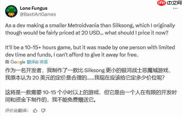 一位正在开发同类型小体量类银河恶魔城游戏的独立开发者坦言感到压力:“我原本打算将游戏定价设为20美元,但《丝之歌》的定价让我不得不重新思考。”这位单人开发者提到,自己的作品虽能提供10到15小时的游戏流程,但由于资源和成本限制,无法效仿低价策略。