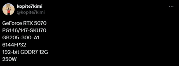 近日,知名爆料人士 @kopite7kimi 爆料出 RTX 5070 及 5070 Ti 显卡的规格,RTX 5070(PCB PG146/147-SKU70)搭载 GB205-300-A1 GPU,配 12G GDDR7 显存,显存位宽 192-bit,拥有 6144 个 CUDA 核心,功耗 250W。从规格来看,该卡应该是 1080p 级别的产品。