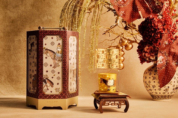 围绕「醉马观花」,野兽派同步推出多款新春香氛器物与礼赠方案,其中以“中国工坊”走马灯香氛礼盒为核心呈现:礼盒由发光蜡烛、走马灯装置与乌檀木螺钿底座组成,点灯点香之间,烛光映入镂空纹样,光影随之缓缓流转,令案头自成一景。该作品并携手国家级非遗“上海剪纸”代表性传承人贡亮共创,以“马踏新岁”的镂空纸艺作品化作金色烛罩的光影语言,让“走马月下”的年景在一屋之内徐徐铺陈。