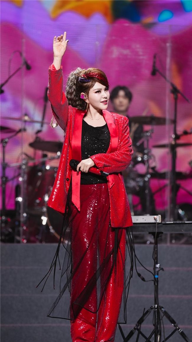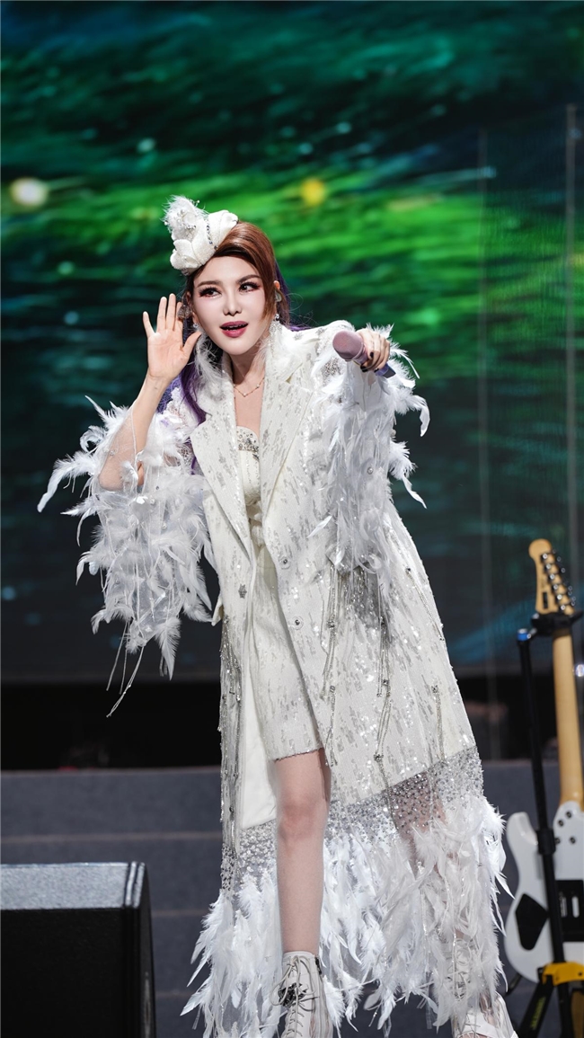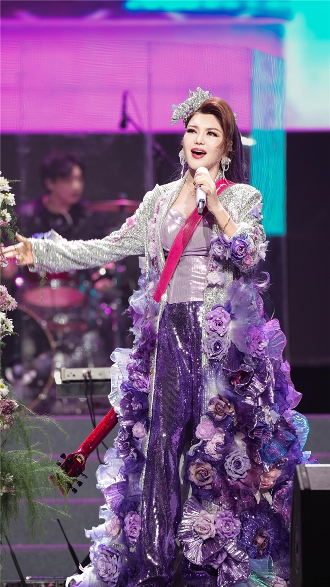 在大家的期待中,乌兰图雅带着温暖的笑容走上舞台。她身着缀满紫色玫瑰花的落地长裙,薄纱花瓣叠着珠光褶皱,像把千朵玫瑰揉进了岁月的柔光,走动时便漾成一片流动的紫雾,连话筒都裹着同色系的柔光。她以《送你一首吉祥的歌》开启了这场音乐之旅,高亢的歌声仿佛将草原的风吹过每个人的耳畔。“三亚的朋友们,你们好!今晚,我要把最美的祝福送到天涯海角!”她的问候如暖流般涌入观众心间。