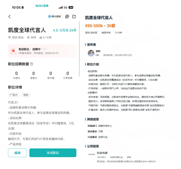 近日,厨电圈的一则特殊“招聘启事”成功破圈,引发了社交媒体和职场平台的双重热议。10月11日,中国高端新厨电专家品牌凯度电器,在其官方微博及猎聘、BOSS直聘等专业平台,正式发布了一则“全球代言人”招聘信息。不走寻常路的“云面试”模式和极具指向性的“职位要求”,让这则招聘迅速发酵,从一次品牌官宣事件,升级为全民参与的热点话题。