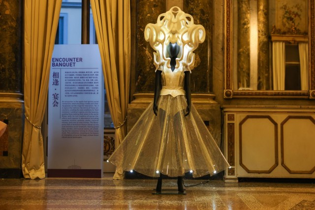 当历史的针脚缀入现代的剪裁,当东方的丝绸映耀西方的珠宝,一场跨越时空的对话在光影间悄然苏醒。“相逢·宴会”展区以“开放与包容”为基调,通过服饰、珠宝与数字艺术作品,重现文明相遇的璀璨时刻,仿若开启多元文化的初遇之旅。