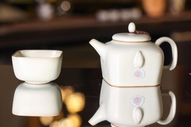 徐结根的《东道主人顺耳茶壶》采用汝官窑工艺,造型简约典雅,其釉面平滑细腻、如同美玉。茶器造型为方中带圆,蕴含方圆之道,展现中国茶文化的哲学内涵。