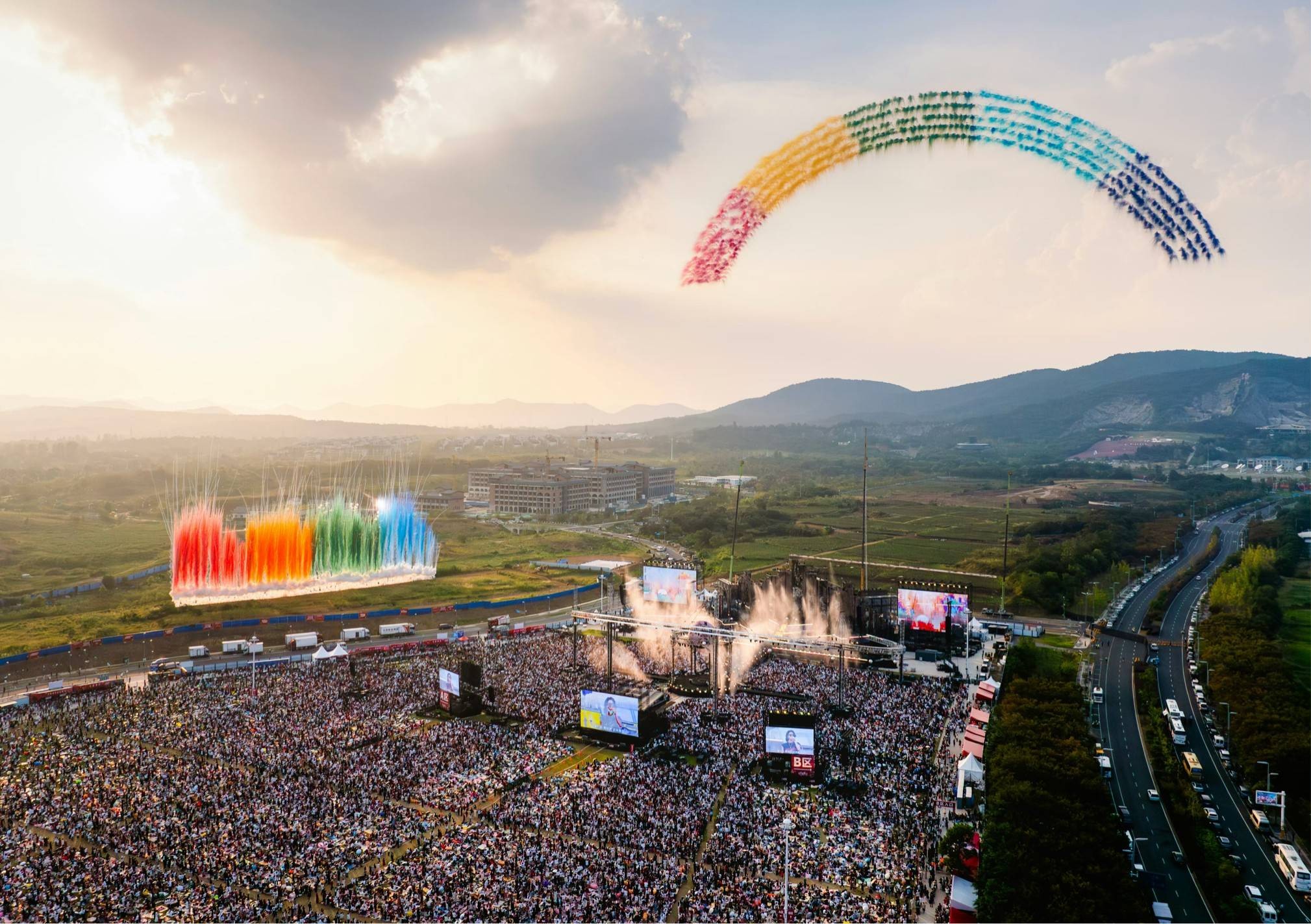 本次南京站首次将演唱会场地升级为全自主打造的乐园生态系统,让演唱会超越了“场”的概念,升维为一个持续八日(10月1-8日)开放的音乐小镇。团队从荒芜平地起步,历时数月完成基建、绿化、舞台搭建及互动区规划,最终呈现出一座集舞台艺术、自然景观与科技娱乐互动于一体的“火星乌托邦”。现场不仅延续了乐园模式的经典设定——全员站票、双场联演、艺术展览与美食市集,更将“火星乌托邦”的核心理念——爱与分享,融入至整体氛围中,真正构建了一个真实存续的情感共同体,也形成了、连接彼此的温暖纽带。