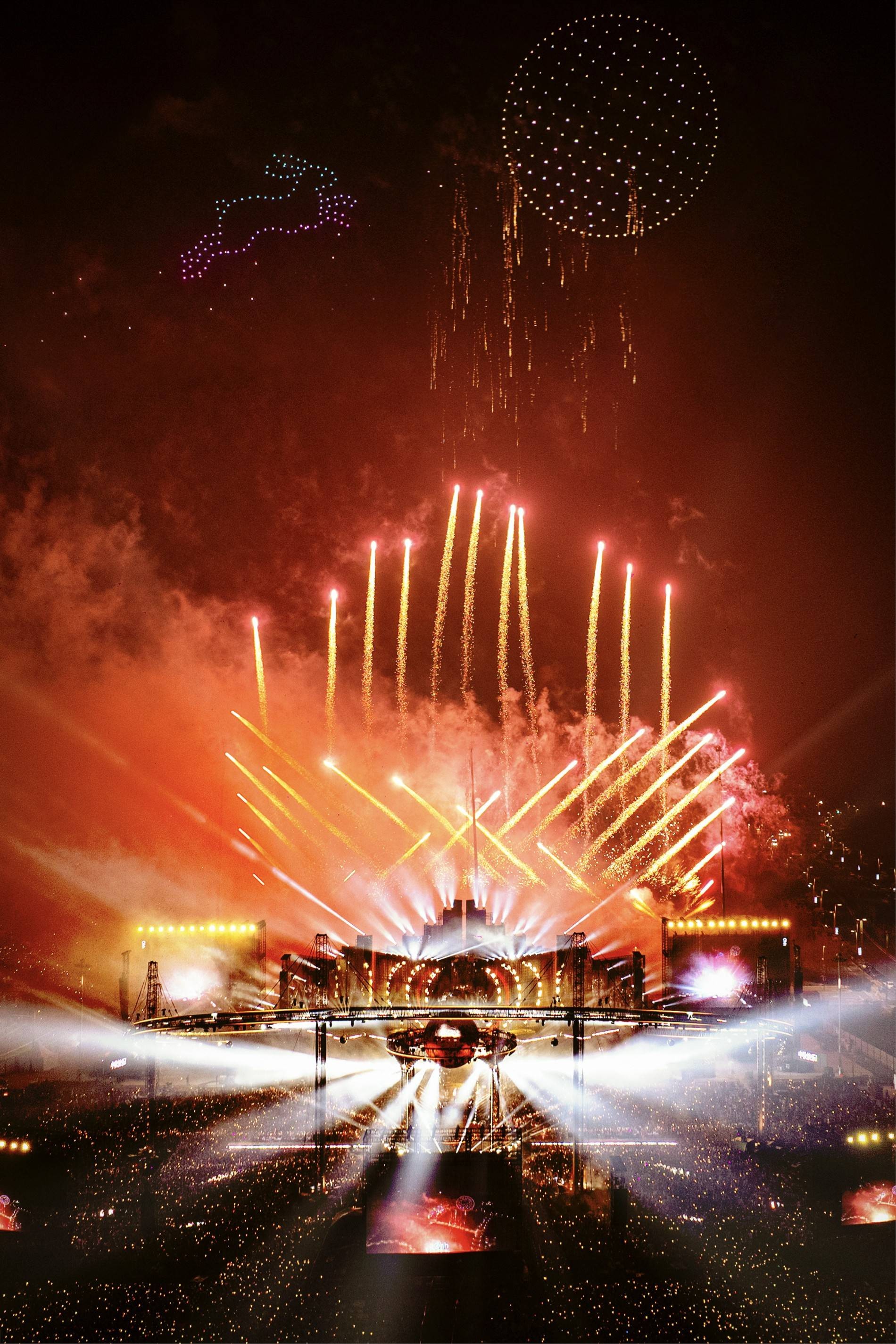 其中,南京站最瞩目的亮点无疑是,华晨宇连续三晚为现场观众们奉上了长达数十分钟的定制烟花秀。从下午场数千架无人机列队释放出祥云般的彩烟,到夜晚每一场演出中精心编排的烟花环节——无论是《永不熄灭的火焰》中象征炽热的“穿云箭”,《斗牛》中气势恢宏的高空烟火,《温暖的房子》里如诗如画的瀑布烟花,还是《点燃银河尽头的篝火》搭配漫天华彩的绚烂,再到《向阳而生》的灿烂和希望,每一处的烟花设计都与歌曲意境紧密呼应,真正做到了“一曲一景,量身打造”。当夜空一次次被点亮,漫天金雨洒落,现场气氛随之沸腾,也将“火星乌托邦”的主题氛围推向高潮。