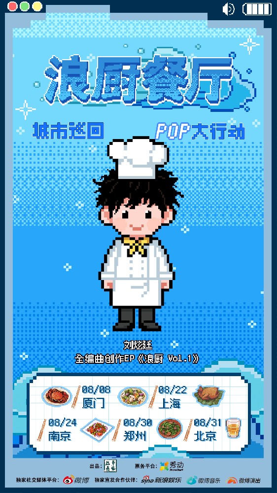 新生代音乐人刘炫廷将于今年8月正式启动「浪厨餐厅」全国巡演,以厦门、上海、南京、郑州、北京五城为舞台,呈现其首张全编曲创作EP《浪厨 Vol.1》的沉浸式音乐盛宴。本次巡演以“音乐料理”为核心理念,将创作比作烹饪过程——词曲为食材,编曲为调味,制作为烹饪,最终端出一席打破风格界限的“东方创意融合菜”。