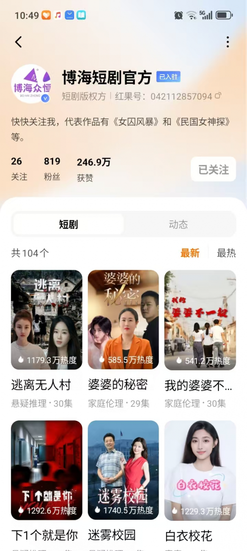 迄今为止,博海众恒传媒已经在红果短剧累计发行上线104部短剧作品,在爱奇艺,优酷视频,芒果TV,搜狐视频,乐视视频,美团和拼多多等五大主流视频网站和短剧平台累计发行上线网络电影和短剧作品将近200部。