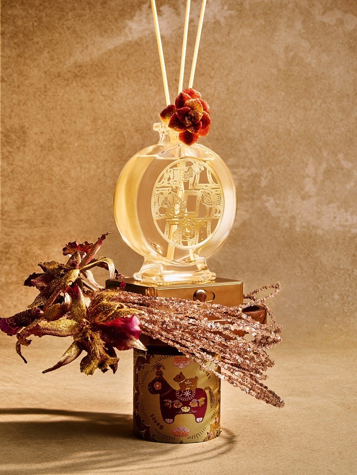 而在更具陈设与收藏意味的年礼选择上,“飞马运宝”晶石香氛罐同样延续「醉马观花」香意,以描金小飞马造型为核心,昂首立于铜钱纹玻璃罩之上,寓意纳财聚福、行运在握。该系列以“晶石藏香”为旨,带来两款不同呈现:其一于罐中点缀晶石珠链,飞马身姿更显灵动;其二以金箔工艺铺陈玻璃罩,金意更盛、光泽更足,为年礼添一份沉稳华彩;该款小飞马亦可作线香香座,让焚香与散香同器相映。两款皆以“运宝入门、福泽绵延”的视觉意象,回应新岁对丰盛与安稳的期盼。