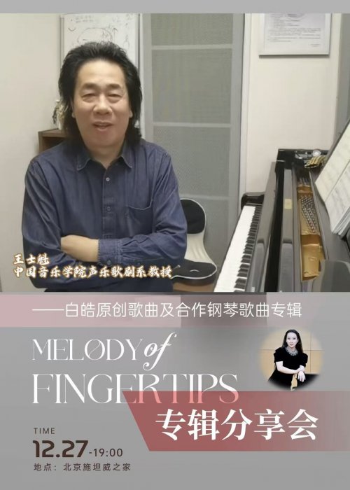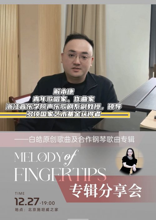 12月27日19时,合作钢琴家白皓将携原创专辑《指尖的旋律》在北京施坦威之家举办专辑分享会,现场呈现其原创歌曲及合作钢琴歌曲作品,多位特邀艺术家将同台助阵。