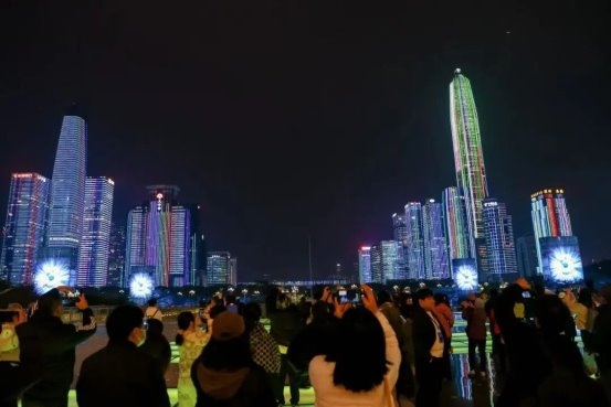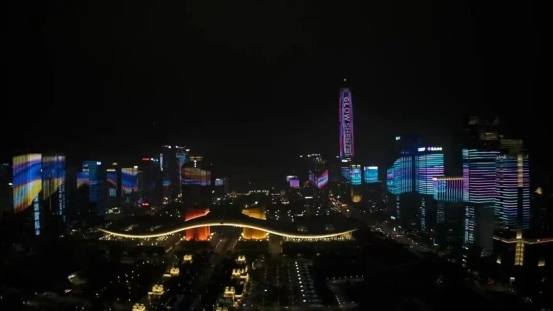 ▲2023年「光合创想」:福田中心区43栋标志性楼宇的主题灯光表演,打造了270°超宽视野的"天际屏幕"。