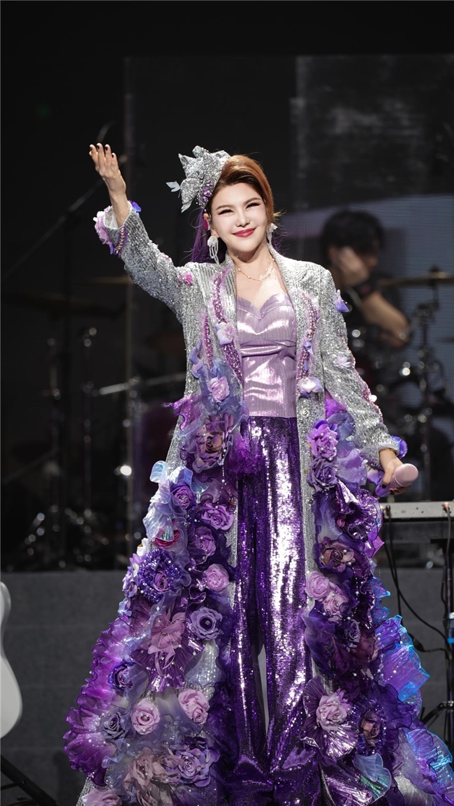在大家的期待中,乌兰图雅带着温暖的笑容走上舞台。她身着缀满紫色玫瑰花的落地长裙,薄纱花瓣叠着珠光褶皱,像把千朵玫瑰揉进了岁月的柔光,走动时便漾成一片流动的紫雾,连话筒都裹着同色系的柔光。她以《送你一首吉祥的歌》开启了这场音乐之旅,高亢的歌声仿佛将草原的风吹过每个人的耳畔。“三亚的朋友们,你们好!今晚,我要把最美的祝福送到天涯海角!”她的问候如暖流般涌入观众心间。
