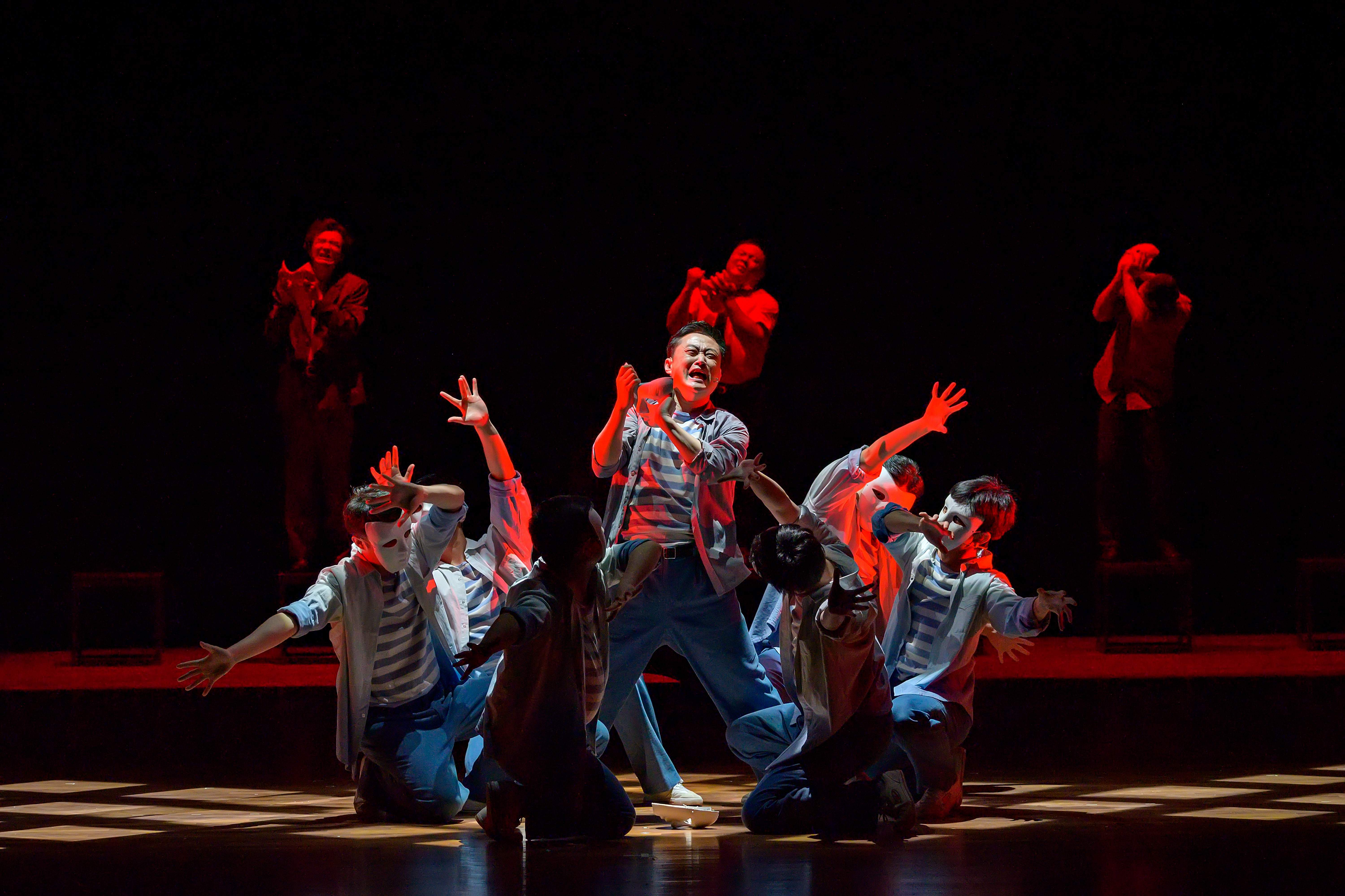 “面具戏”堪称全剧的精神高潮,六个面具人如异化的制度之影缠绕池大为,十二只手从不同方向拉扯撕裂,构成卡夫卡式的荒诞图景与内心外化的剧场瞬间。池大为挣脱面具之时,既是个体良知的觉醒,亦是知识分子在制度异化中对本真性的艰难持守。