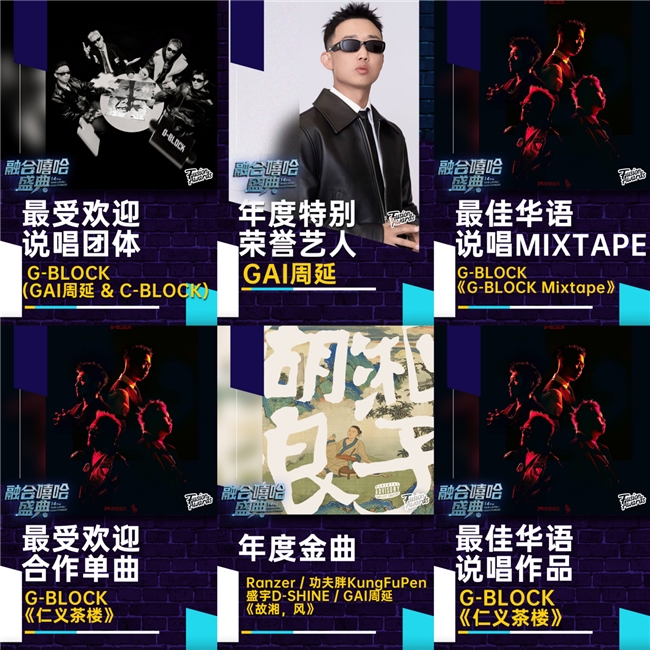 本次融合嘻哈盛典,新华流说唱领军人GAI周延再度斩获六项大奖——“年度特别荣誉艺人”“最受欢迎合作单曲G-BLOCK《仁义茶楼》”、“最佳华语说唱作品G-BLOCK《仁义茶楼》”、“最受欢迎说唱团体G-BLOCK《GAI周延&C-BLOCK》”、“最佳华语说唱MIXTAPE《G-BLOCK Mixtape》”、“年度金曲Ranzer/功夫胖KungFuPen/盛宇D-SHINE/GAI周延《故湘,风》”。